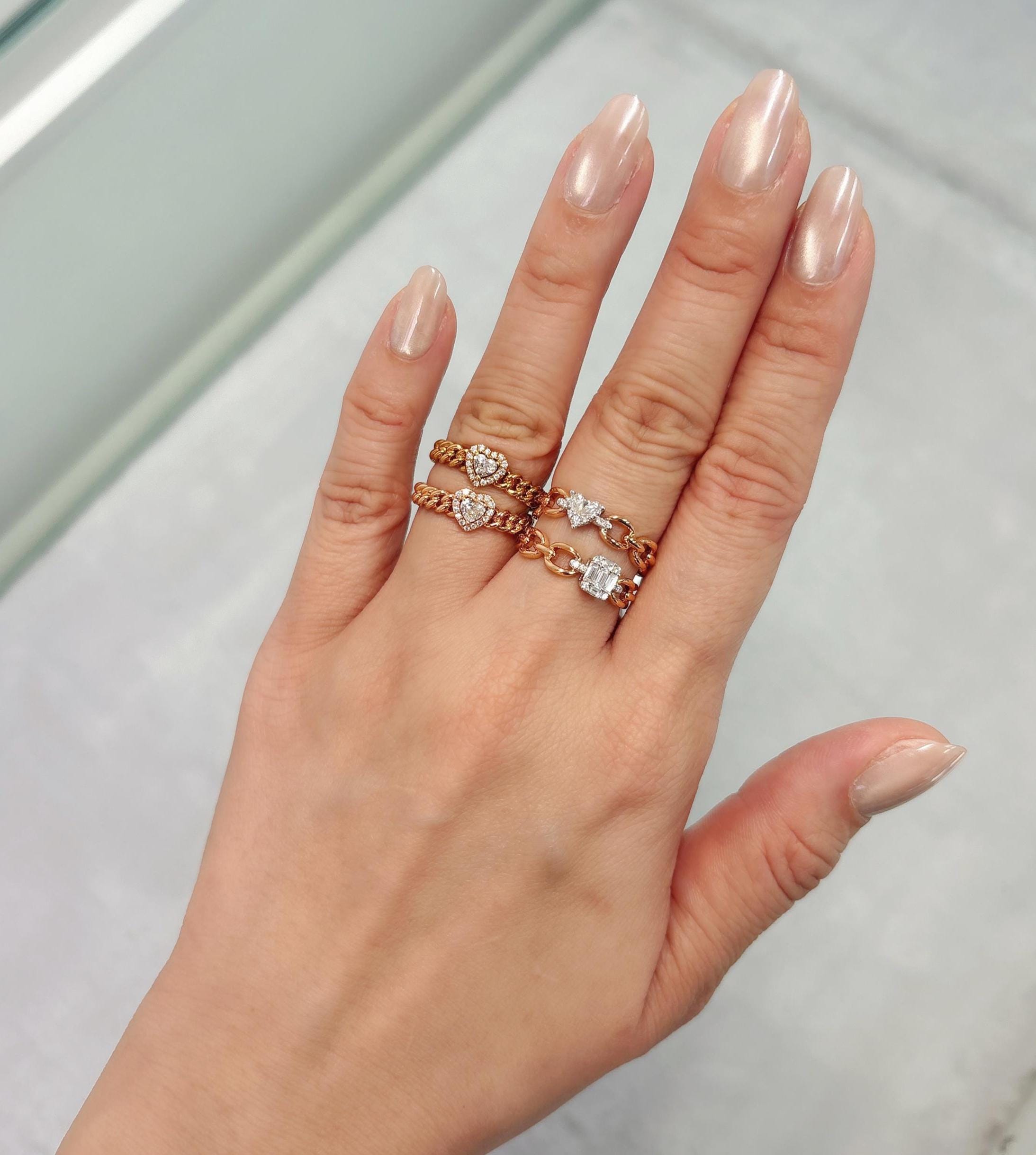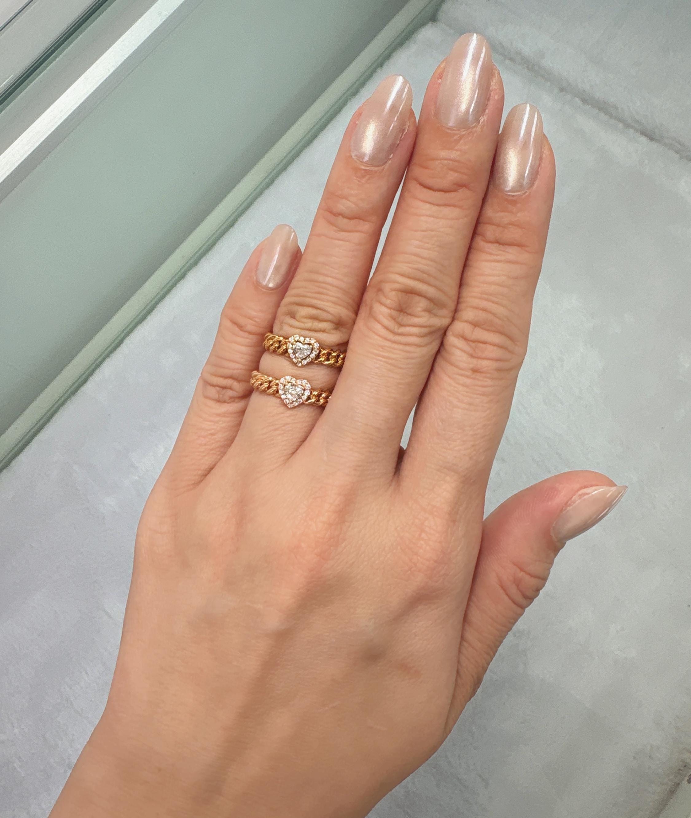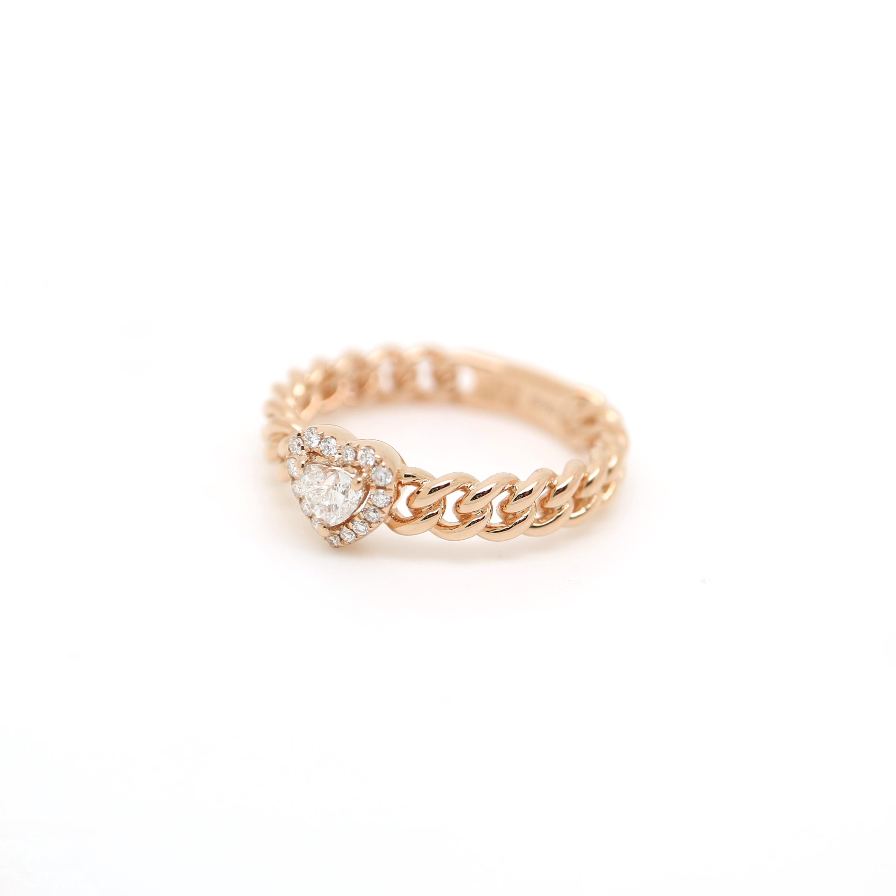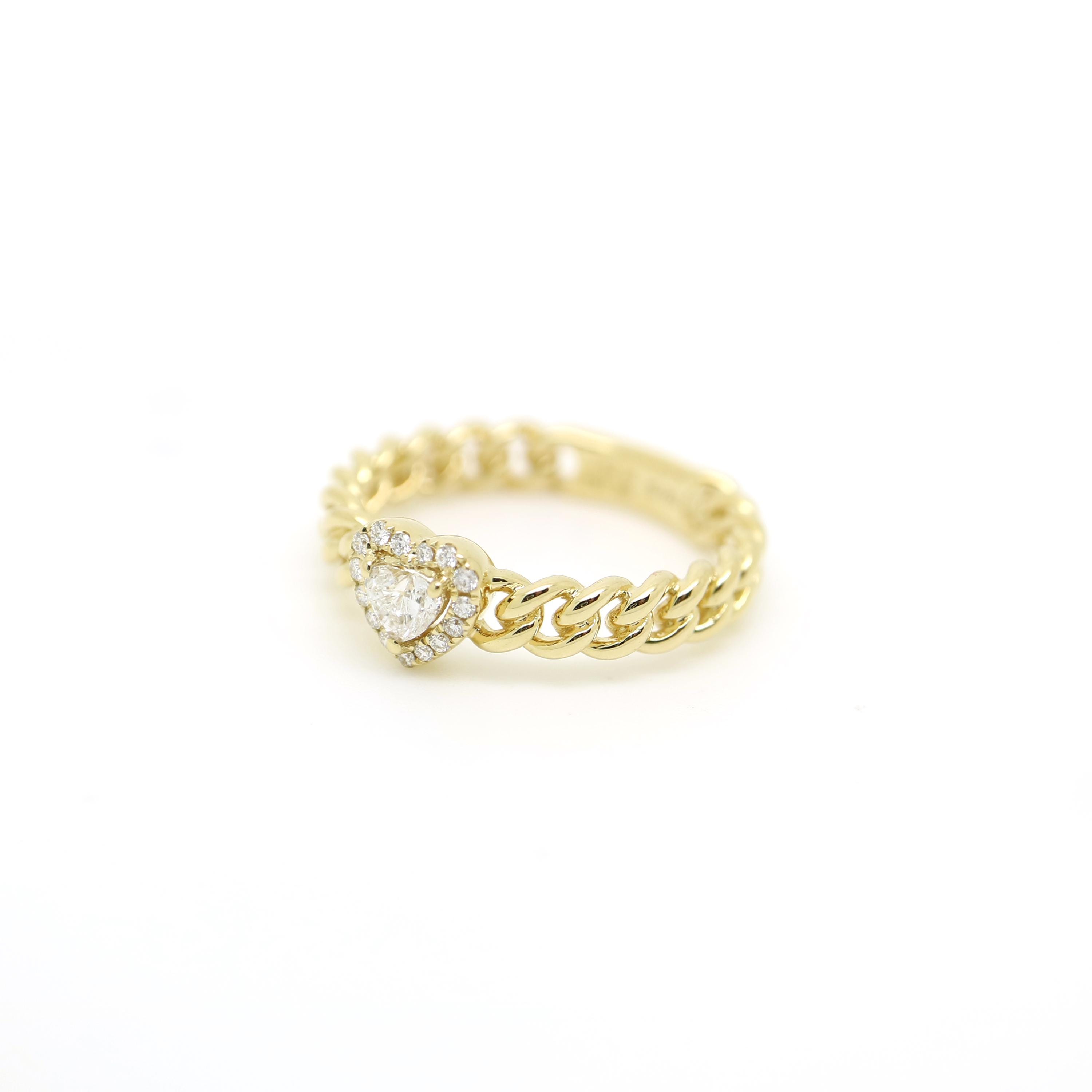Handcrafted in 18K gold, this ring features a linked, stacked band with a heart-shaped diamond nestled in a delicate halo. The chunky chain texture adds a cool, modern feel while the subtle sparkle keeps it easy to wear-perfect for everyday wear or mixed into your favorite stack.