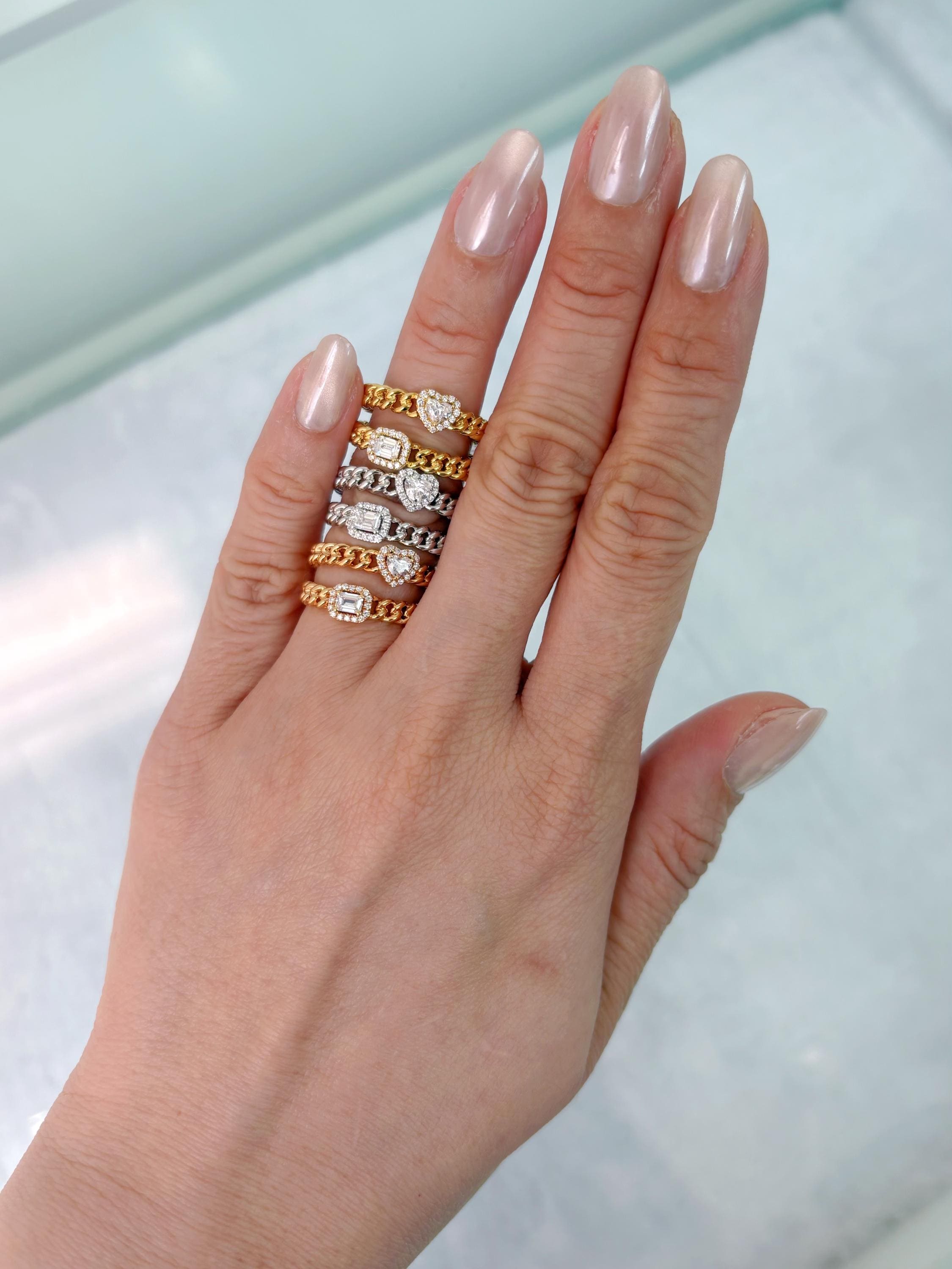 Handcrafted in 18K gold, this double-band ring blends two chain-link bands-one finished with a diamond heart halo, the other with a chic emerald-cut center stone framed in diamonds. The linked texture ties the design together for a modern, stackable look you can wear every day.