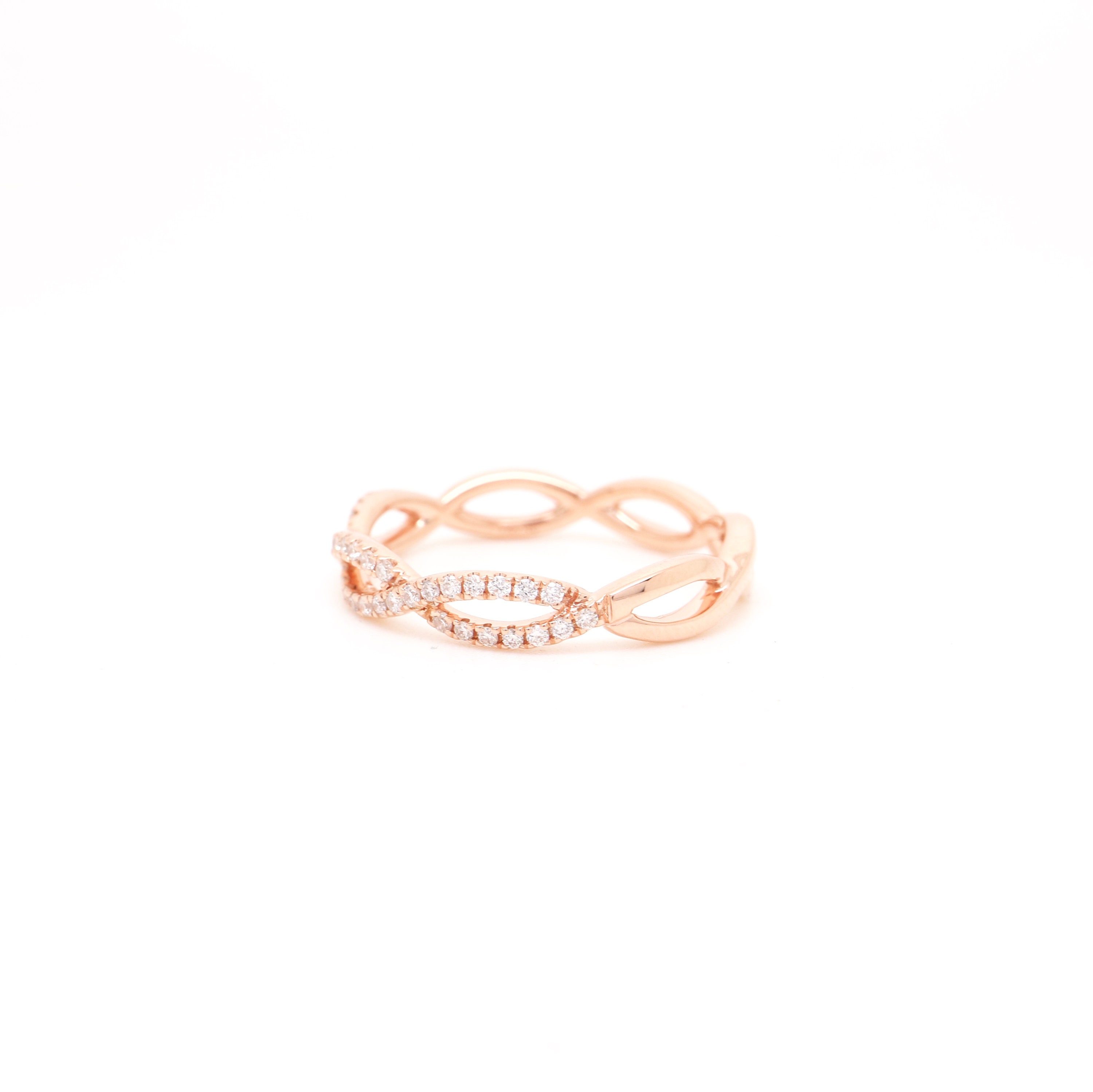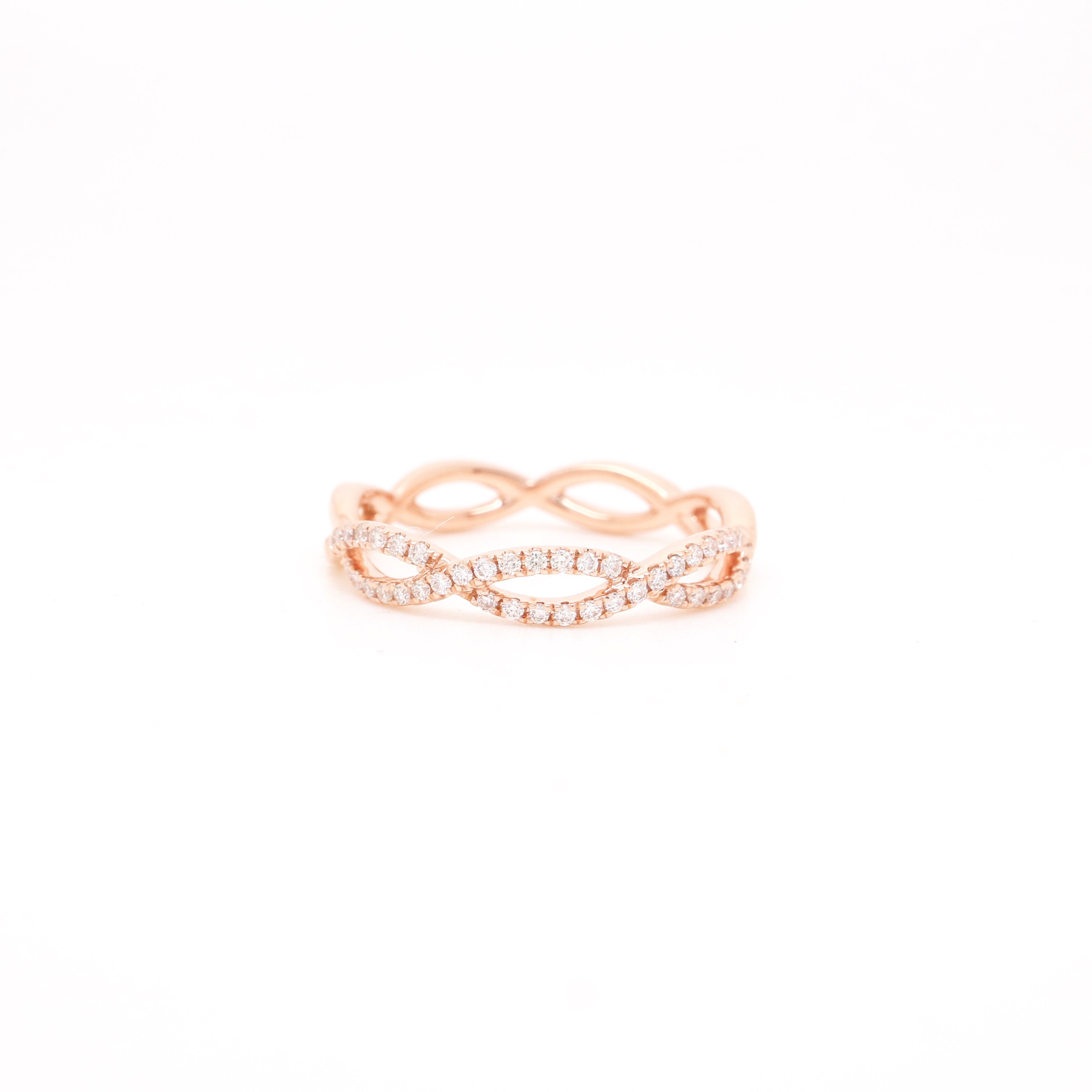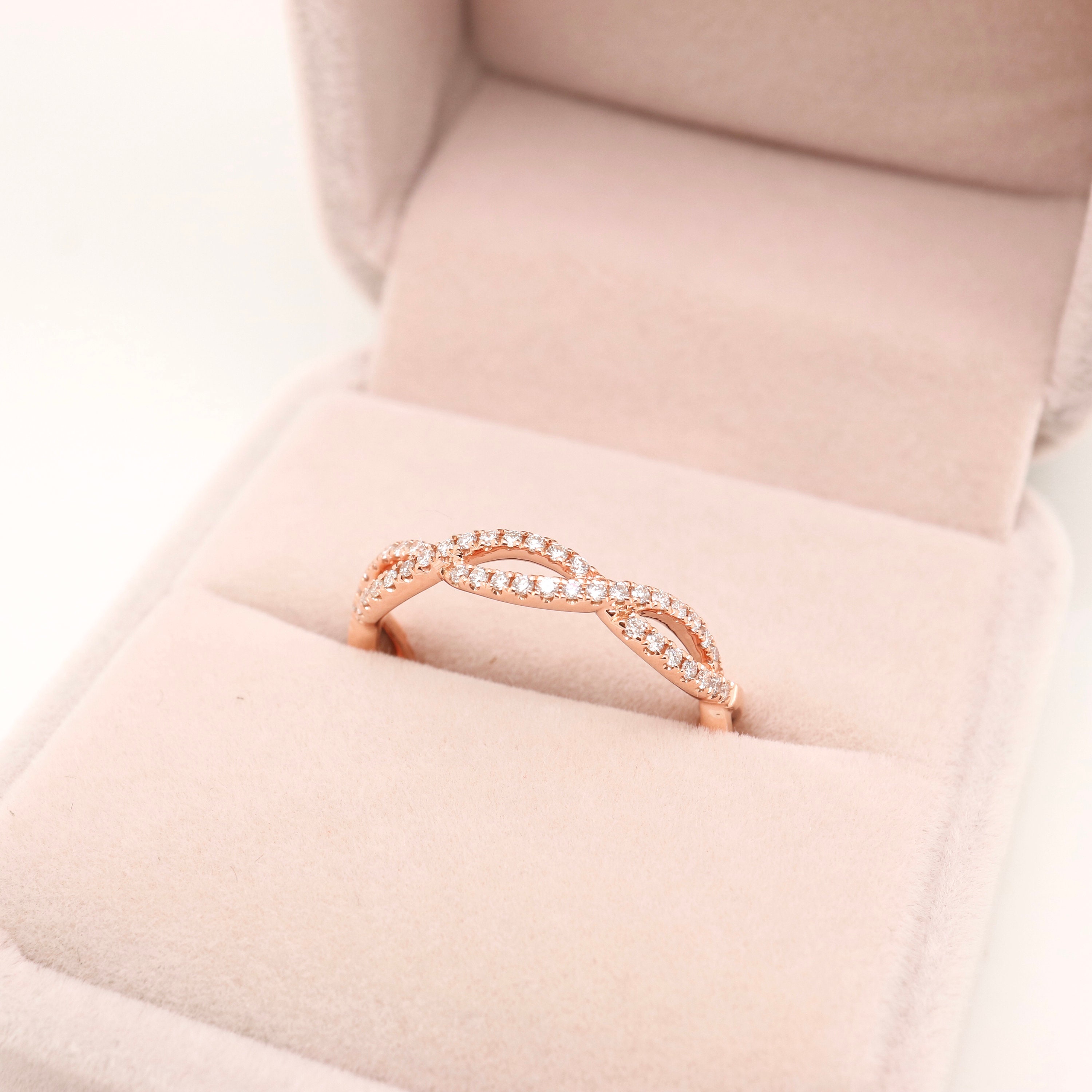 The Infinity Wedding Band can be worn solo or stacked with other rings as a modern set. Cast from polished 18K rose gold, it's set with 0.22ct of pavéd diamonds that catch the light from every angle.