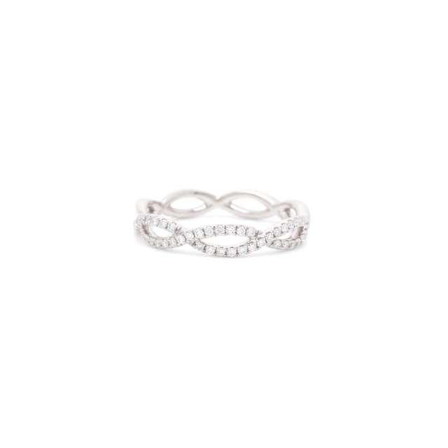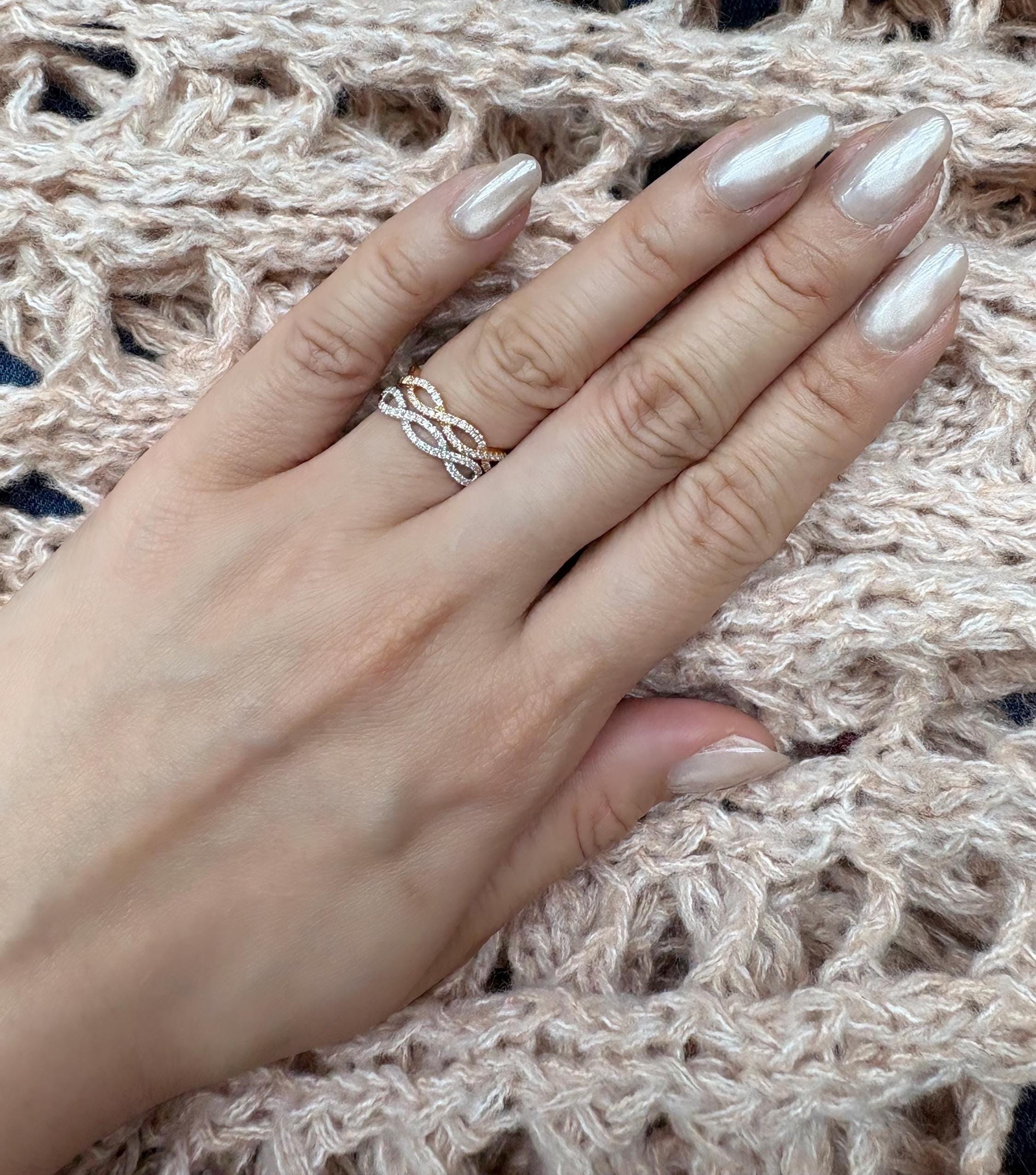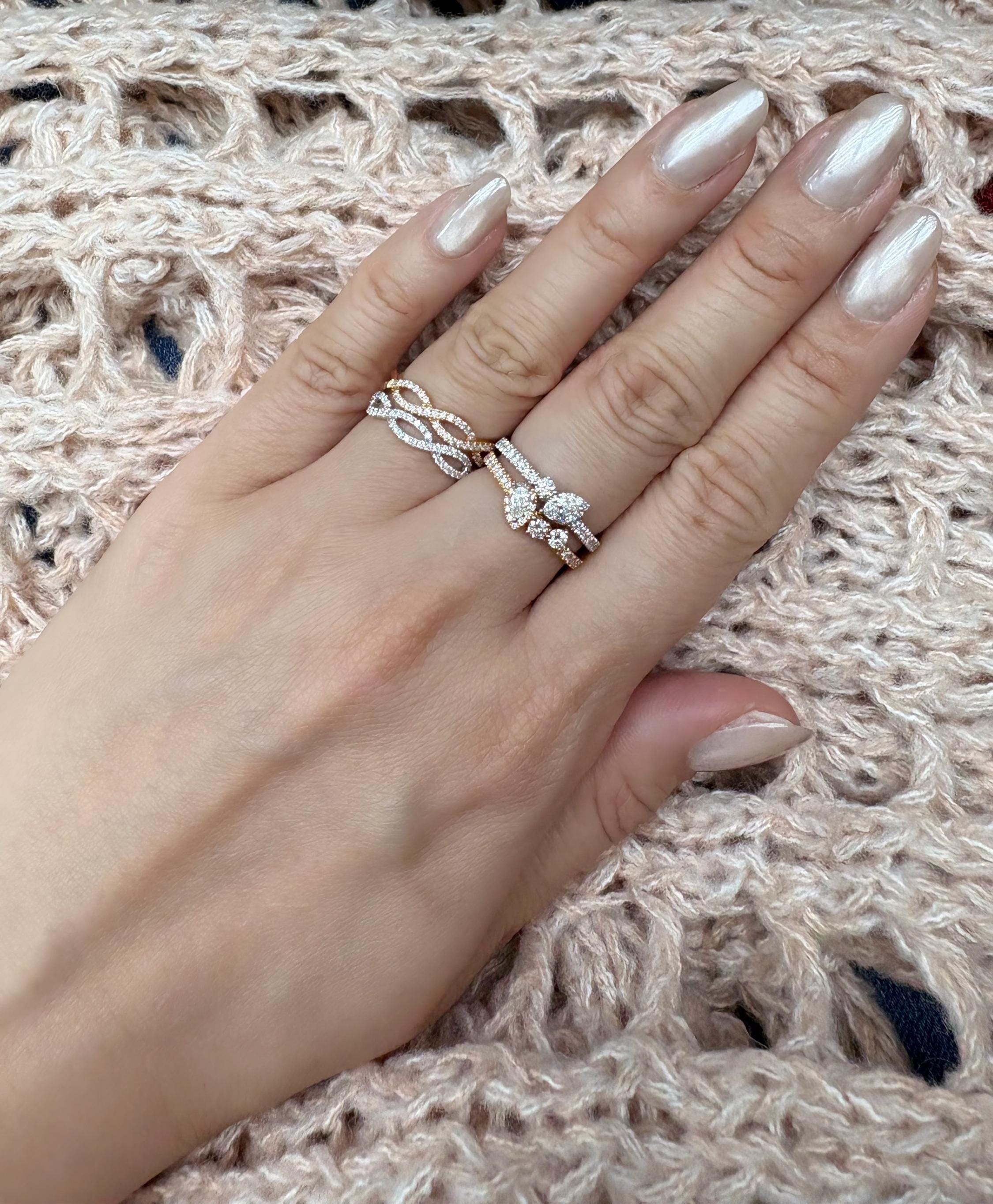 The Infinity Wedding Band can be worn solo or stacked with other rings as a modern set. Cast from polished 18K rose gold, it's set with 0.22ct of pavéd diamonds that catch the light from every angle.