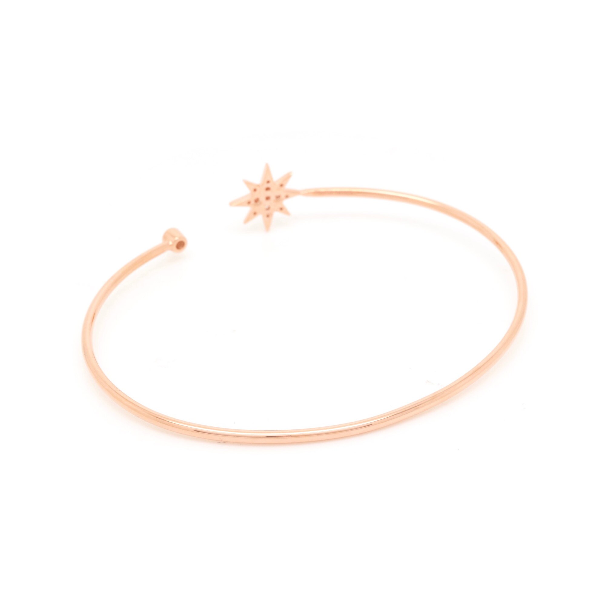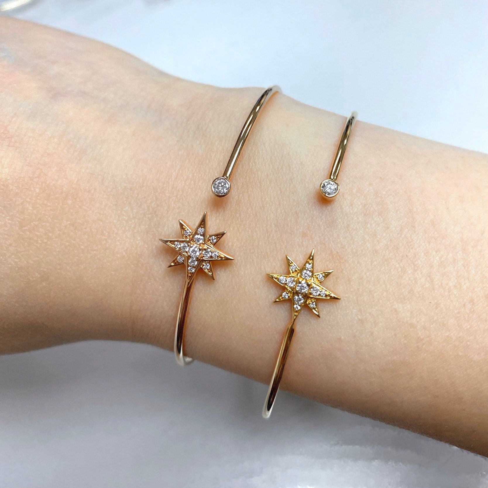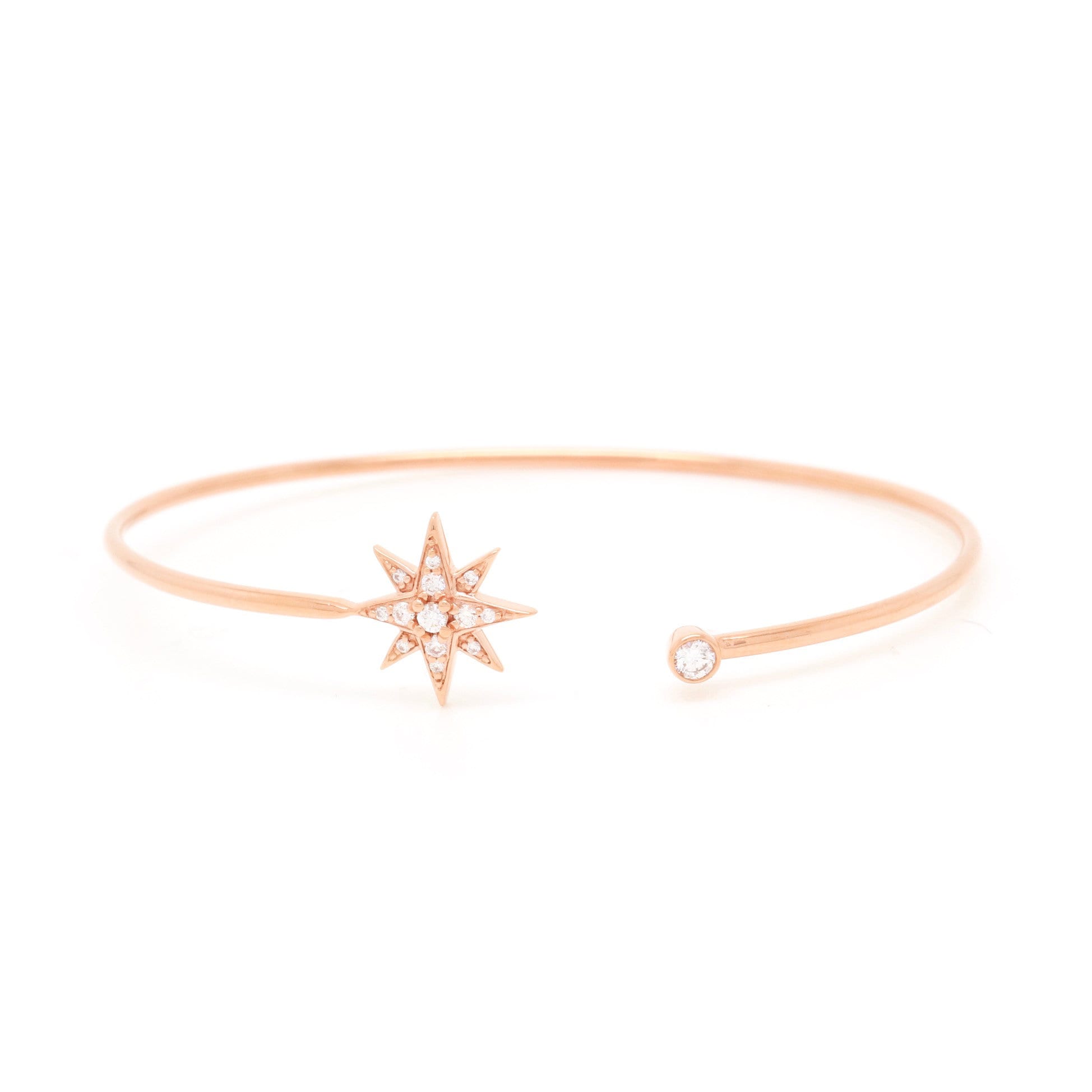 High polished 18K gold bangle tipped with diamond-embellished star and shimmering bezel set diamond.