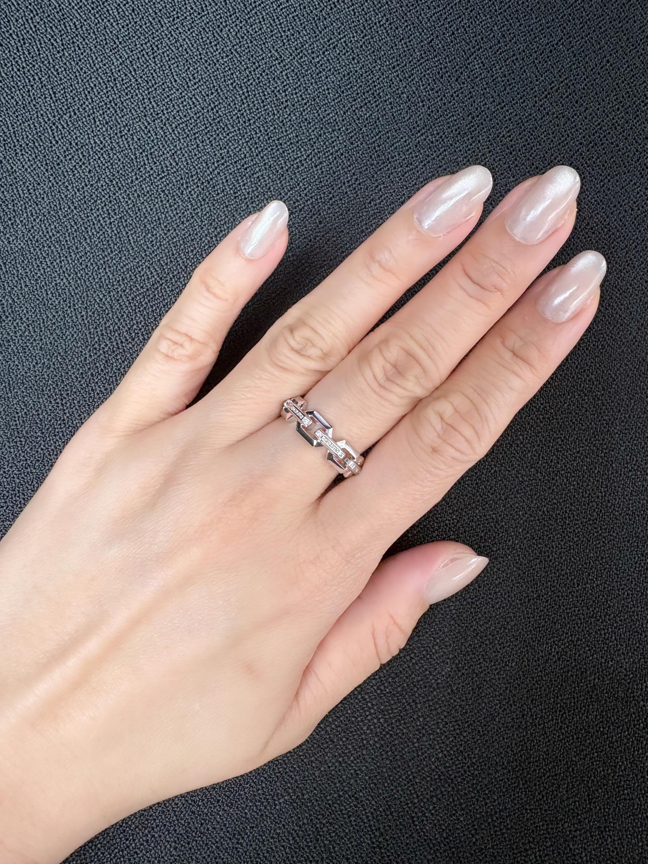 Handmade in 18K gold, this chain-link band features hex-style links with a row of small diamonds on the front. Clean, modern lines with a hint of sparkle-easy to wear daily or stack with other rings.