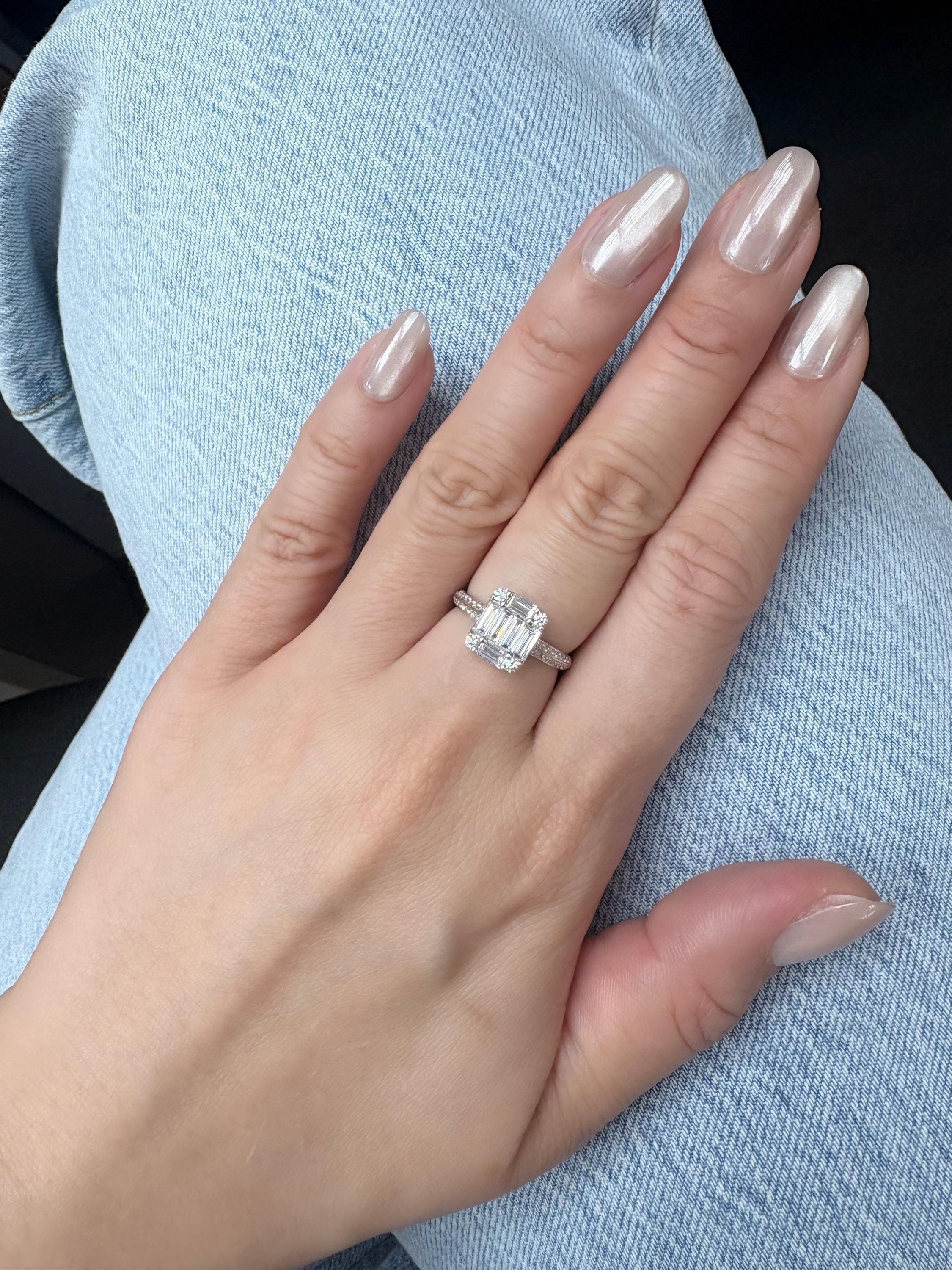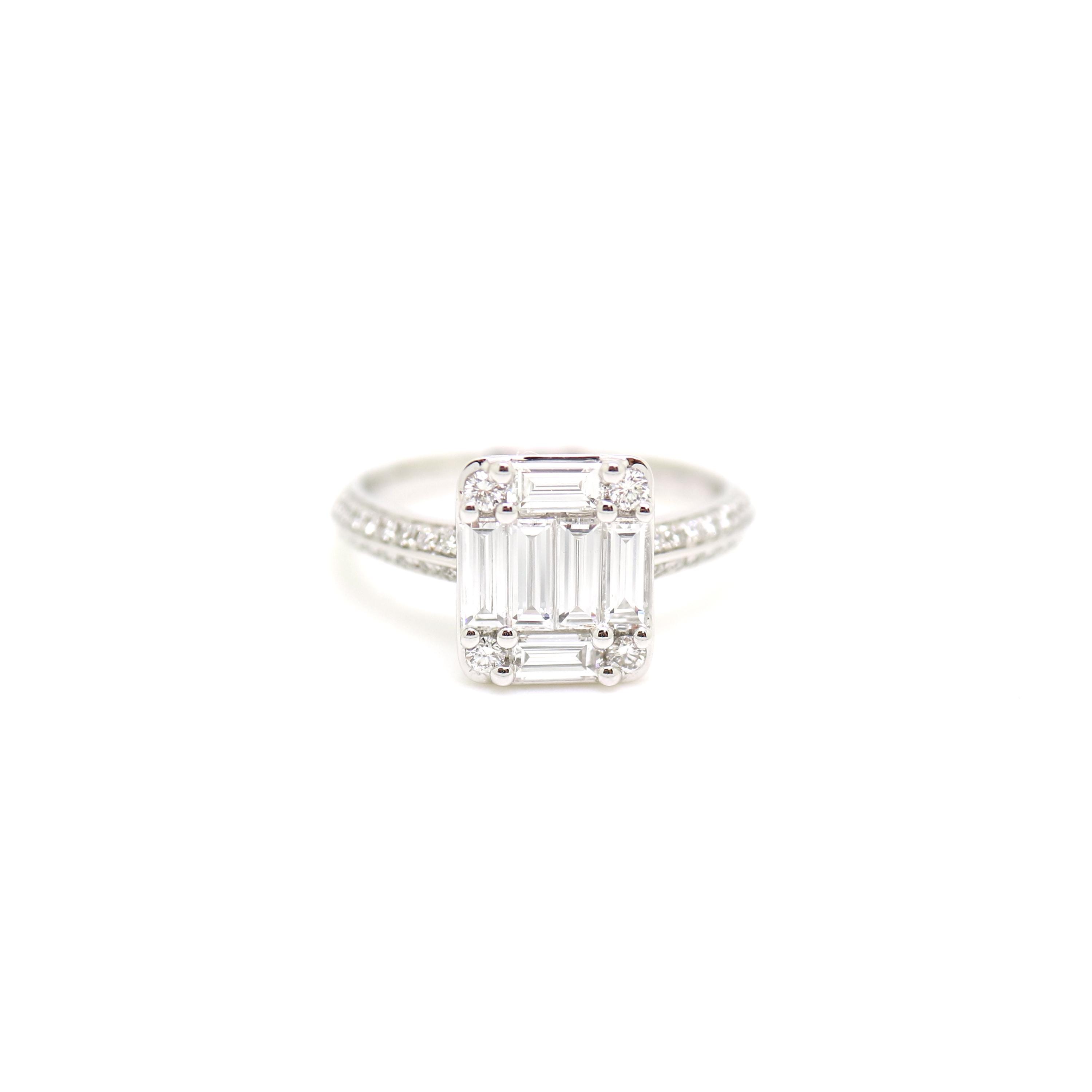 This rectangular cluster ring features vertical baguette diamonds framed by tiny round diamonds and a delicate pavé band. Modern, structured, and easy to wear every day.
