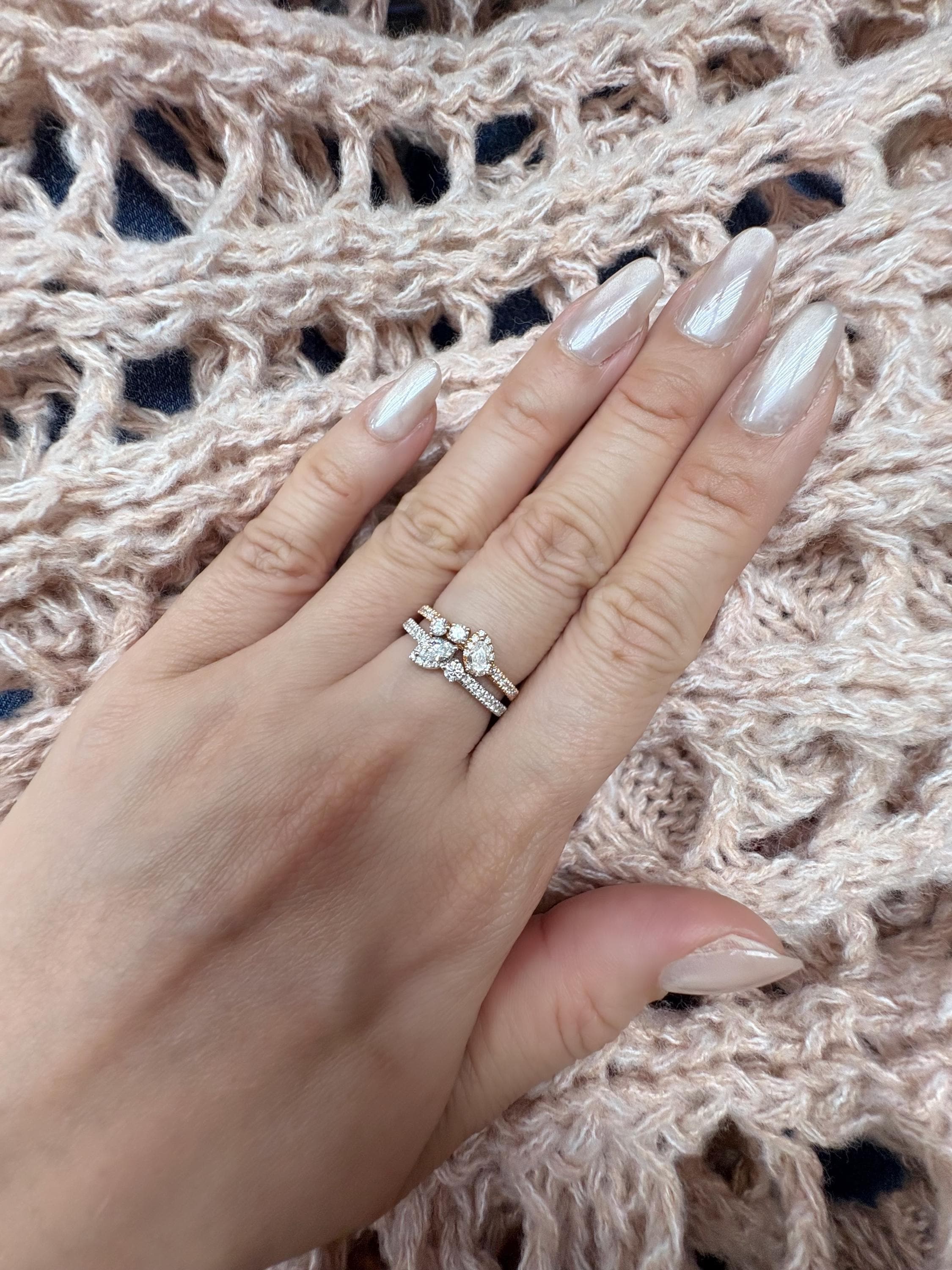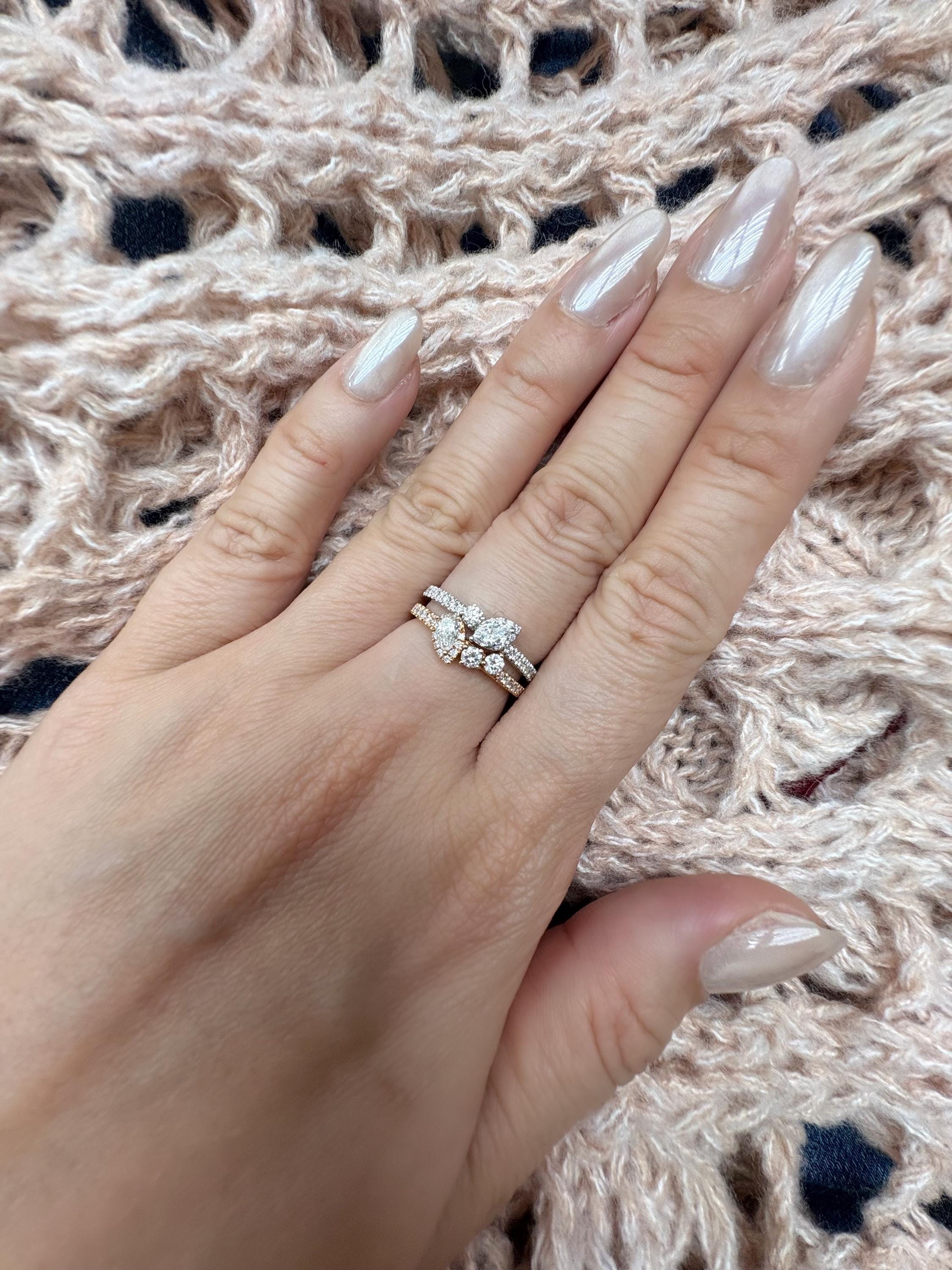 Handcrafted in 18K two‑tone gold, this two-piece stack showcases pear and marquise diamonds with round accents and pavé shanks for effortless everyday sparkle.