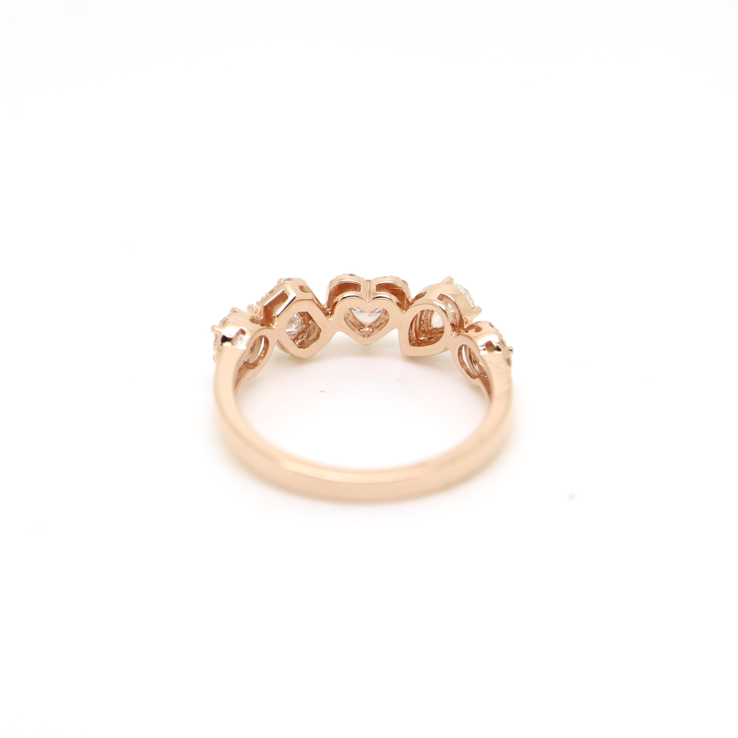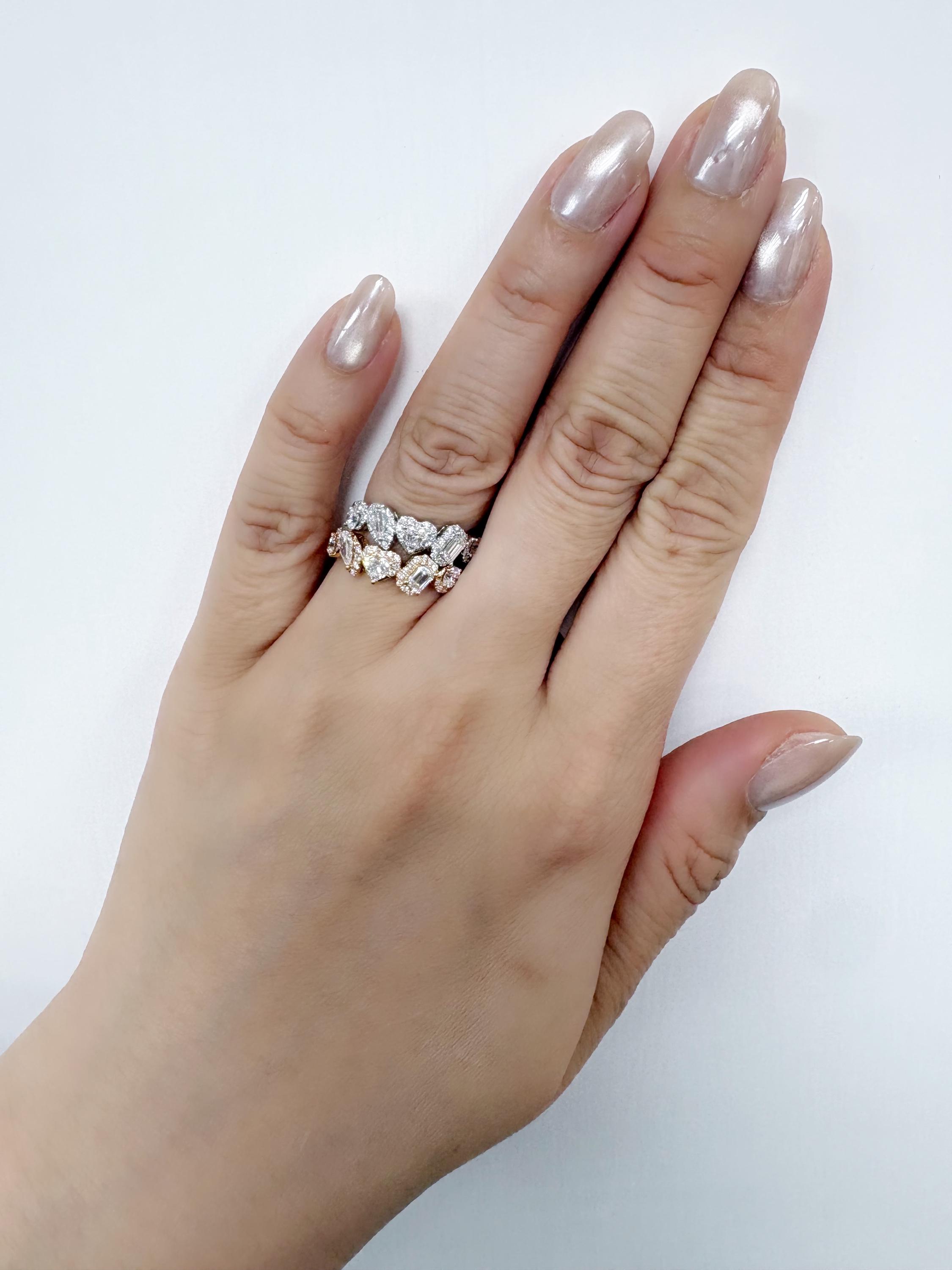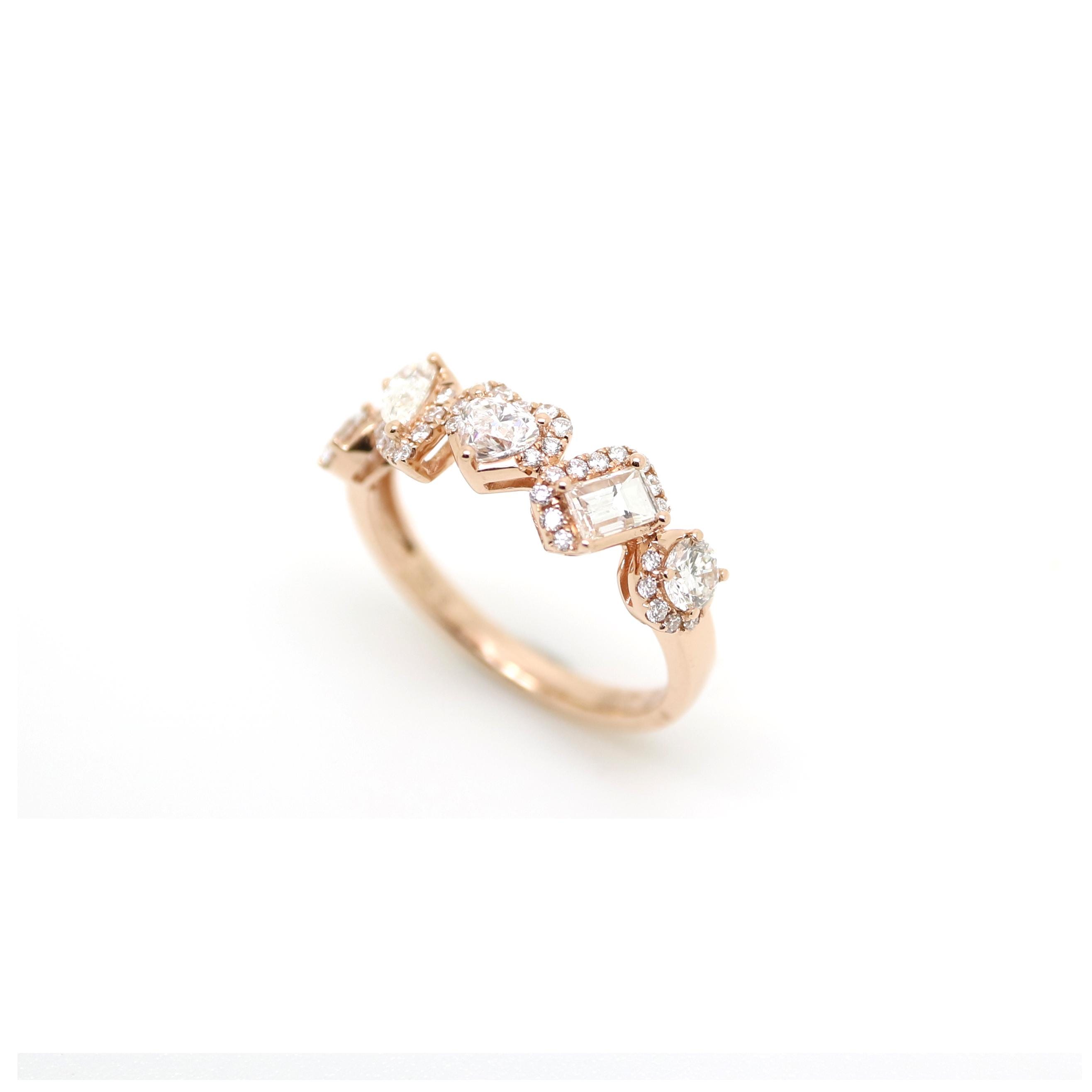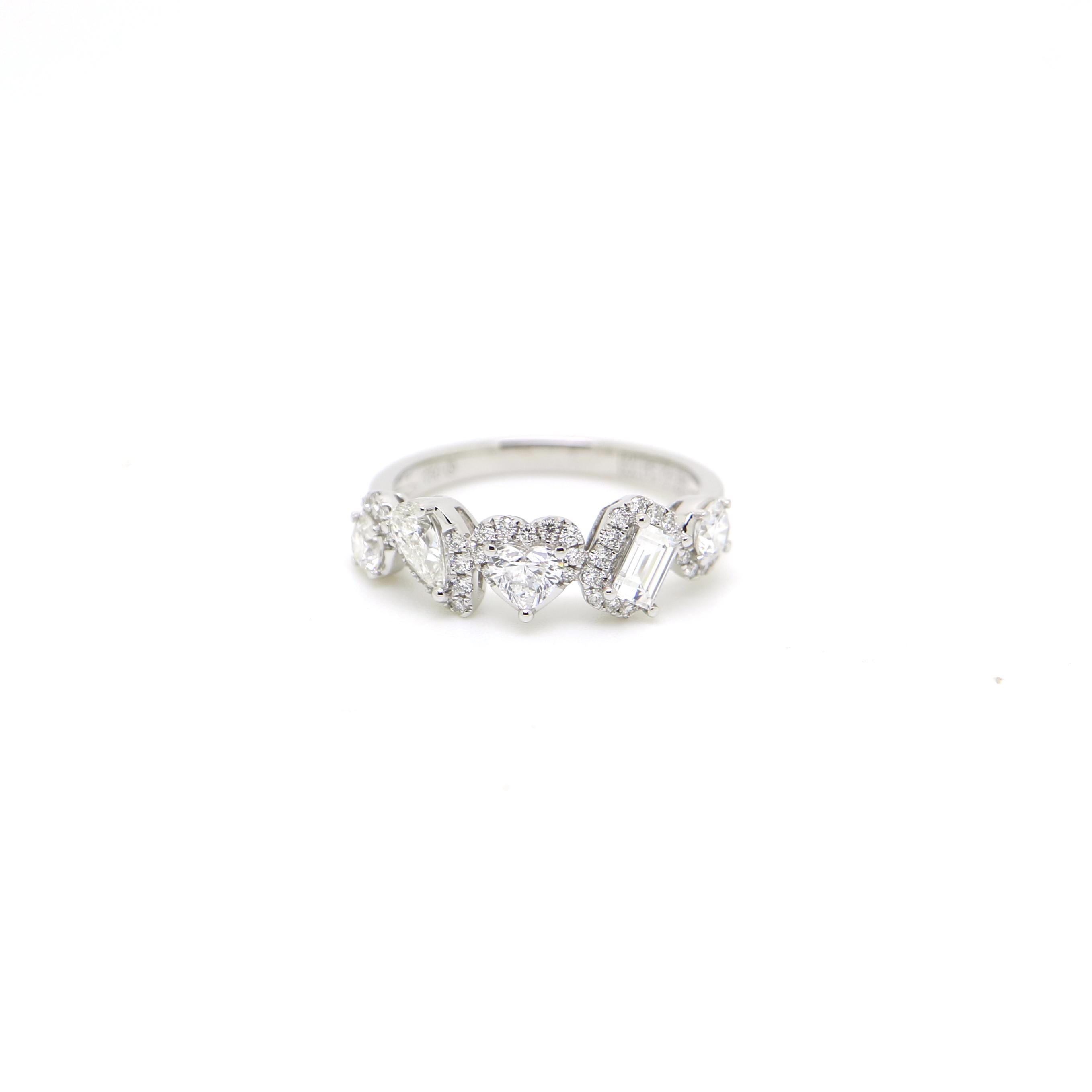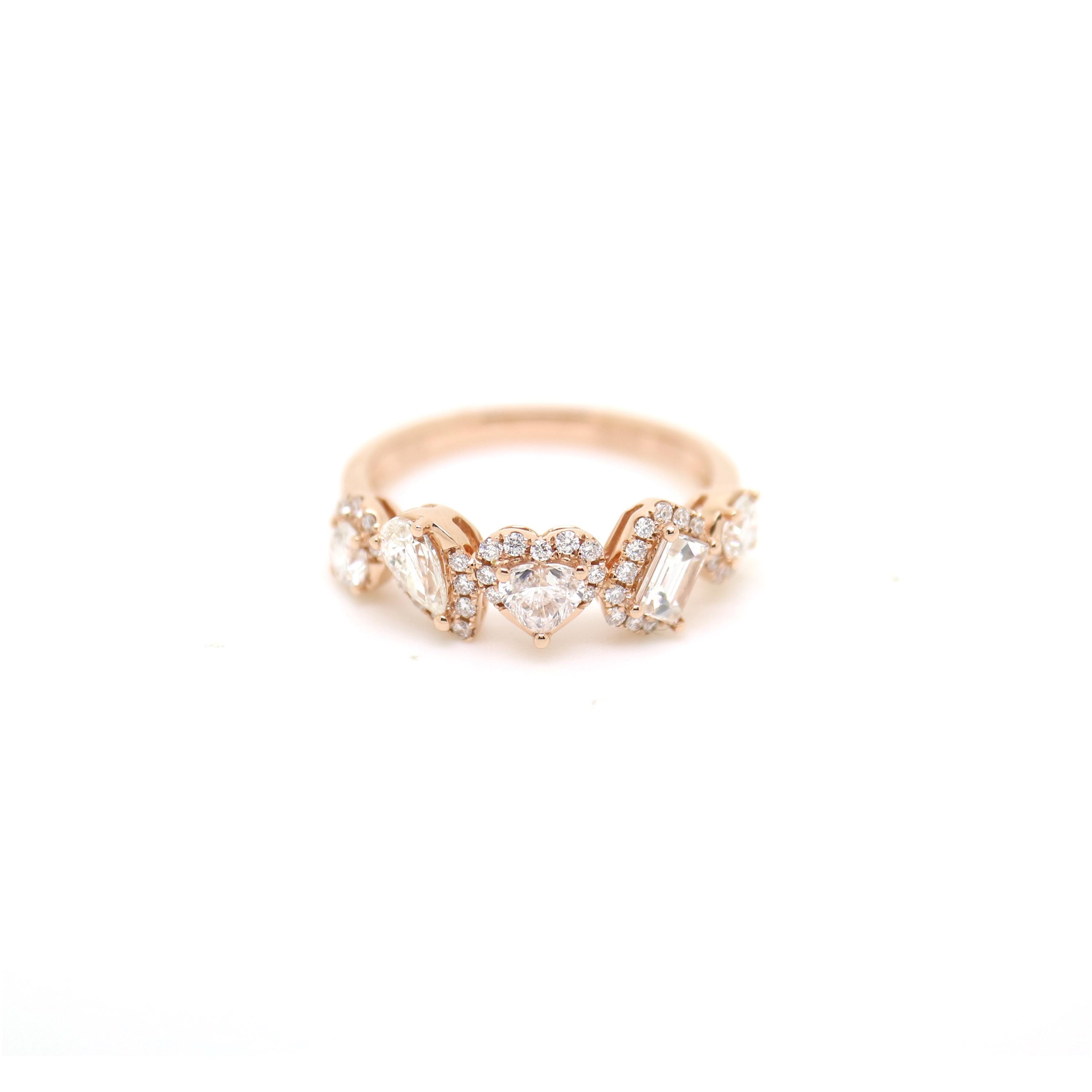 Delicate band set in 18K gold featuring different diamond shapes — heart, pear, emerald cut and round accents-each haloed by pavé halo. Feminine, sparkling, and perfect as a stack or everyday statement.