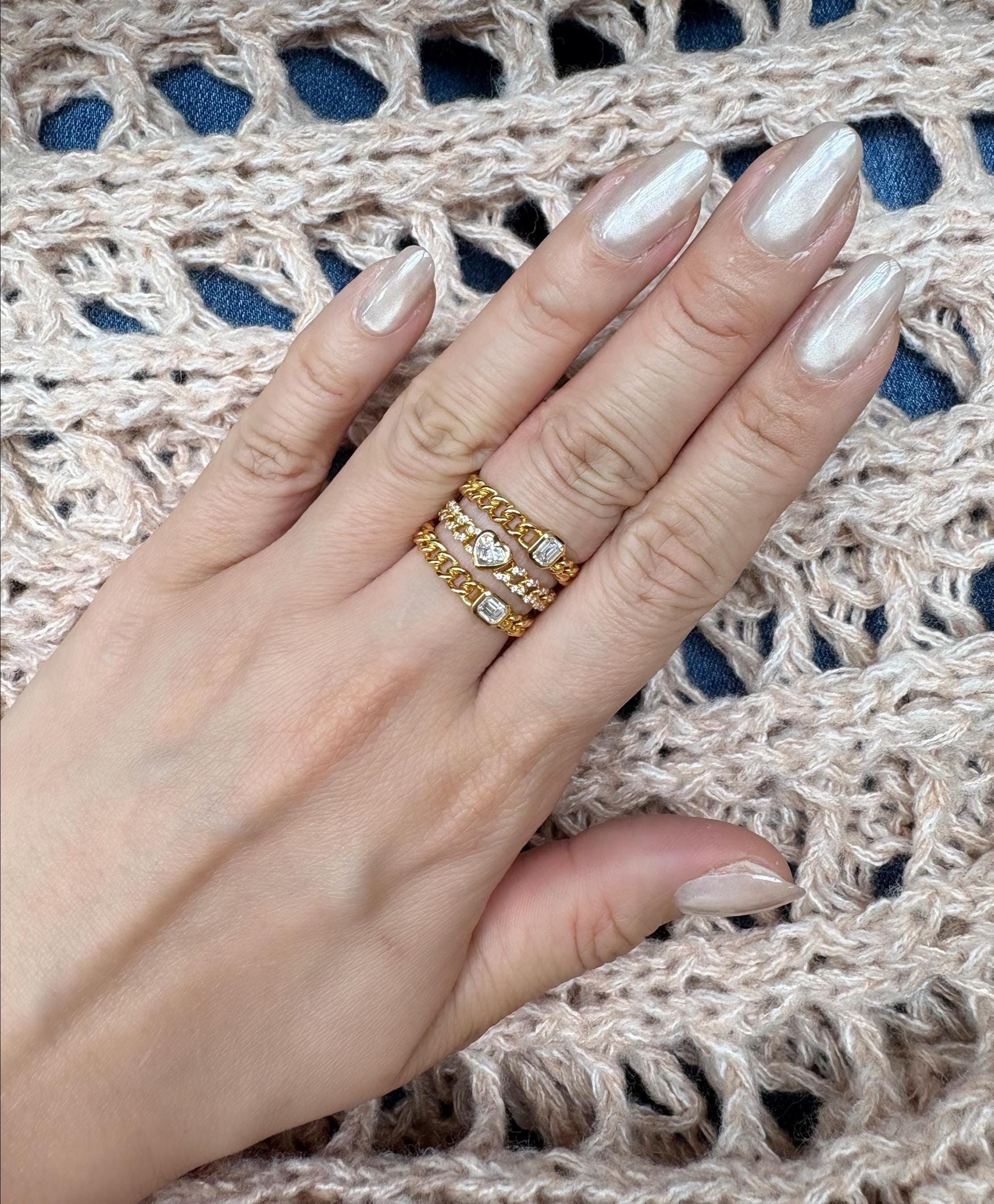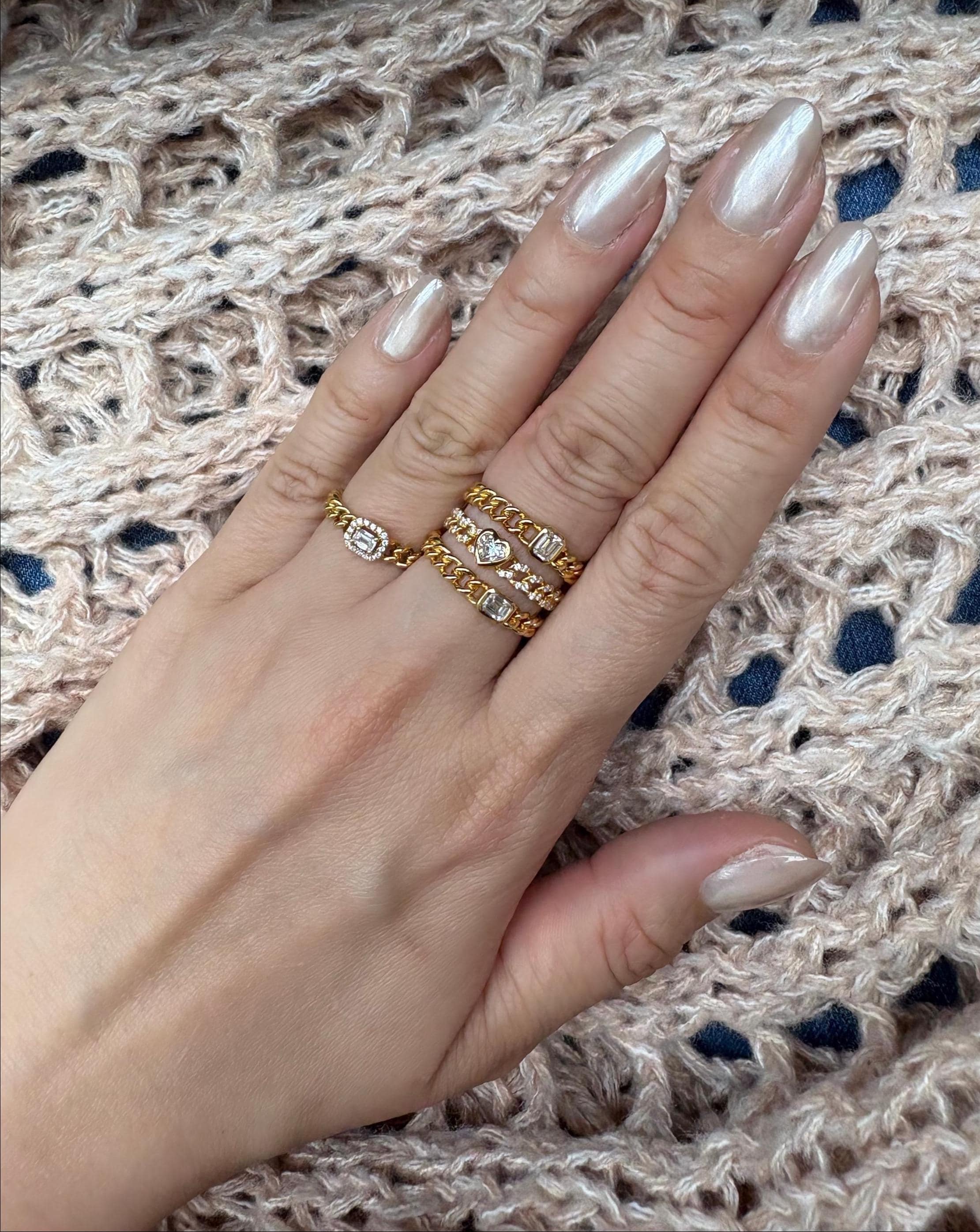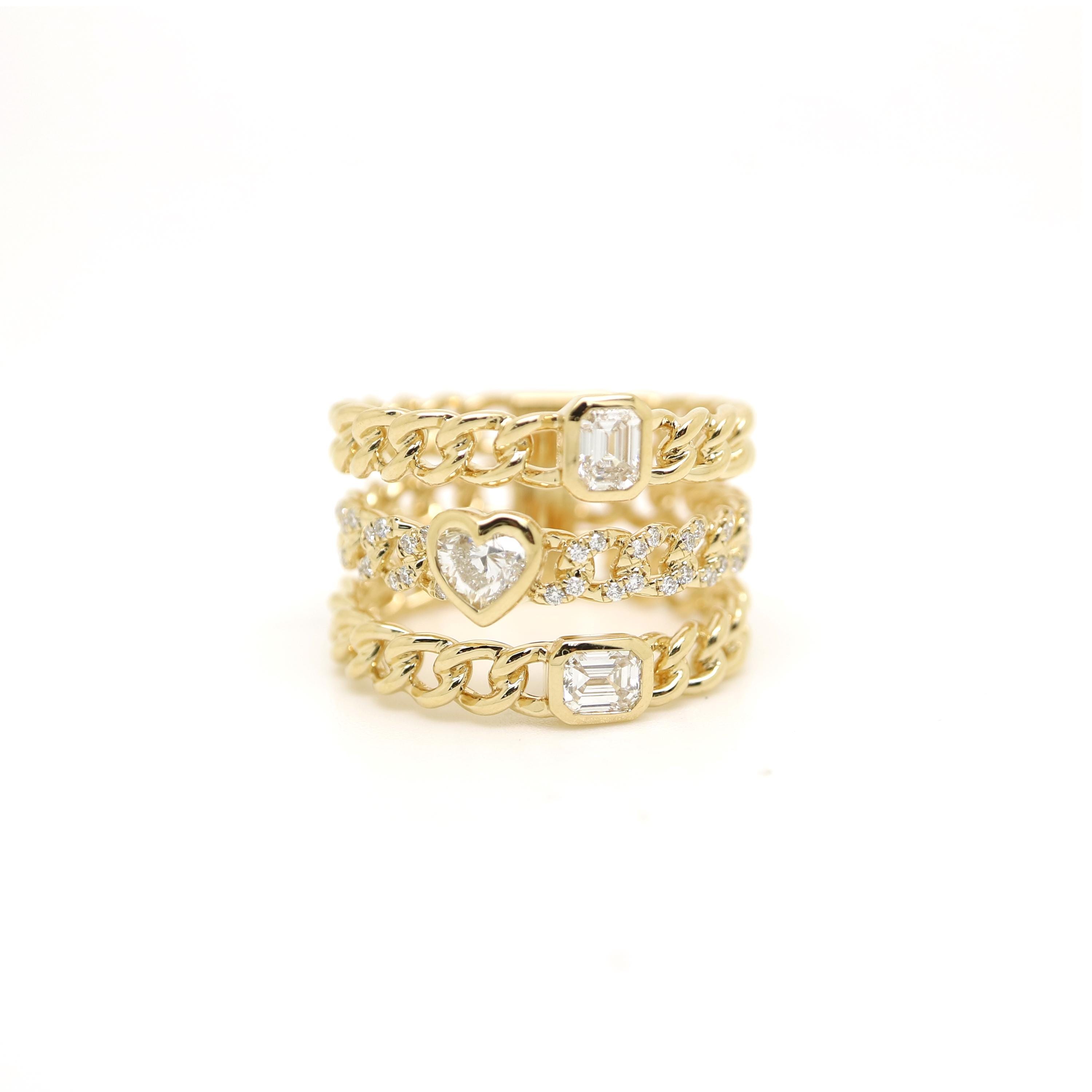 Handmade in 18K gold, this three‑band ring combines chain‑link texture with a heart shaped diamond and two emerald cut diamonds, the trio of main gems are bezel‑set for a sleek, modern finish. Simple and chic, it’s designed for everyday sparkle.