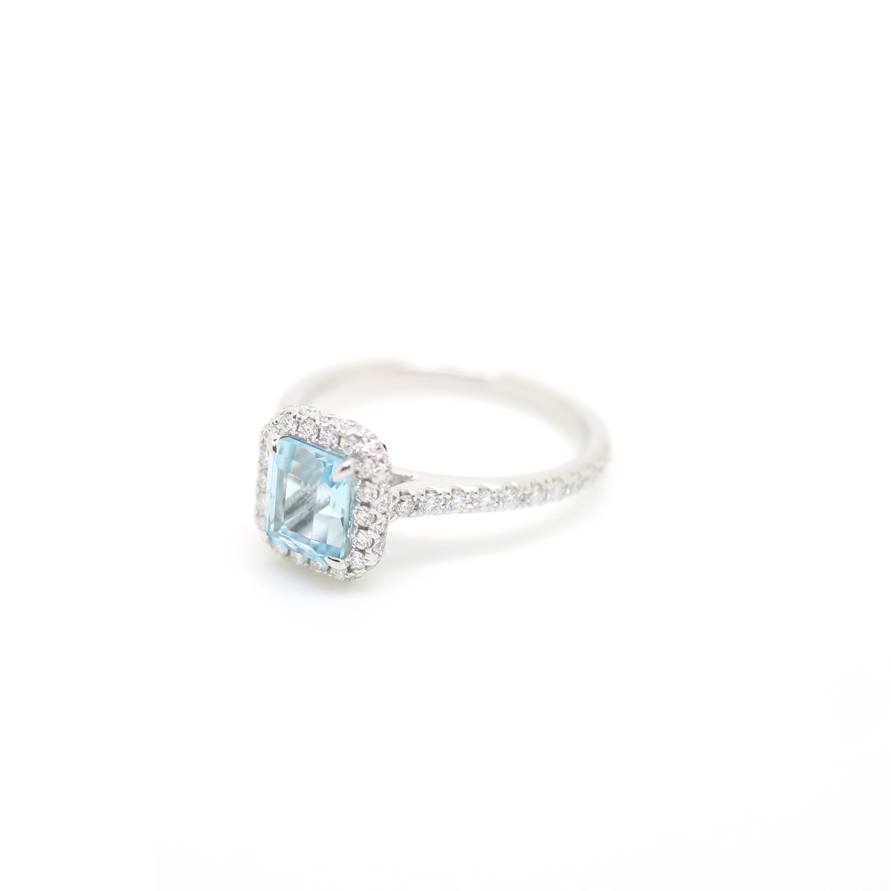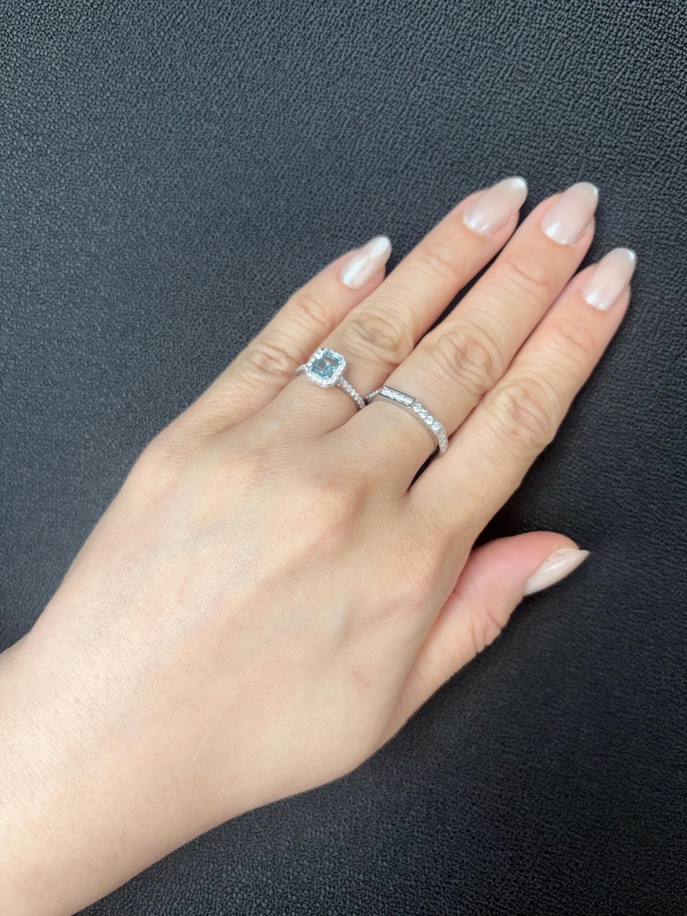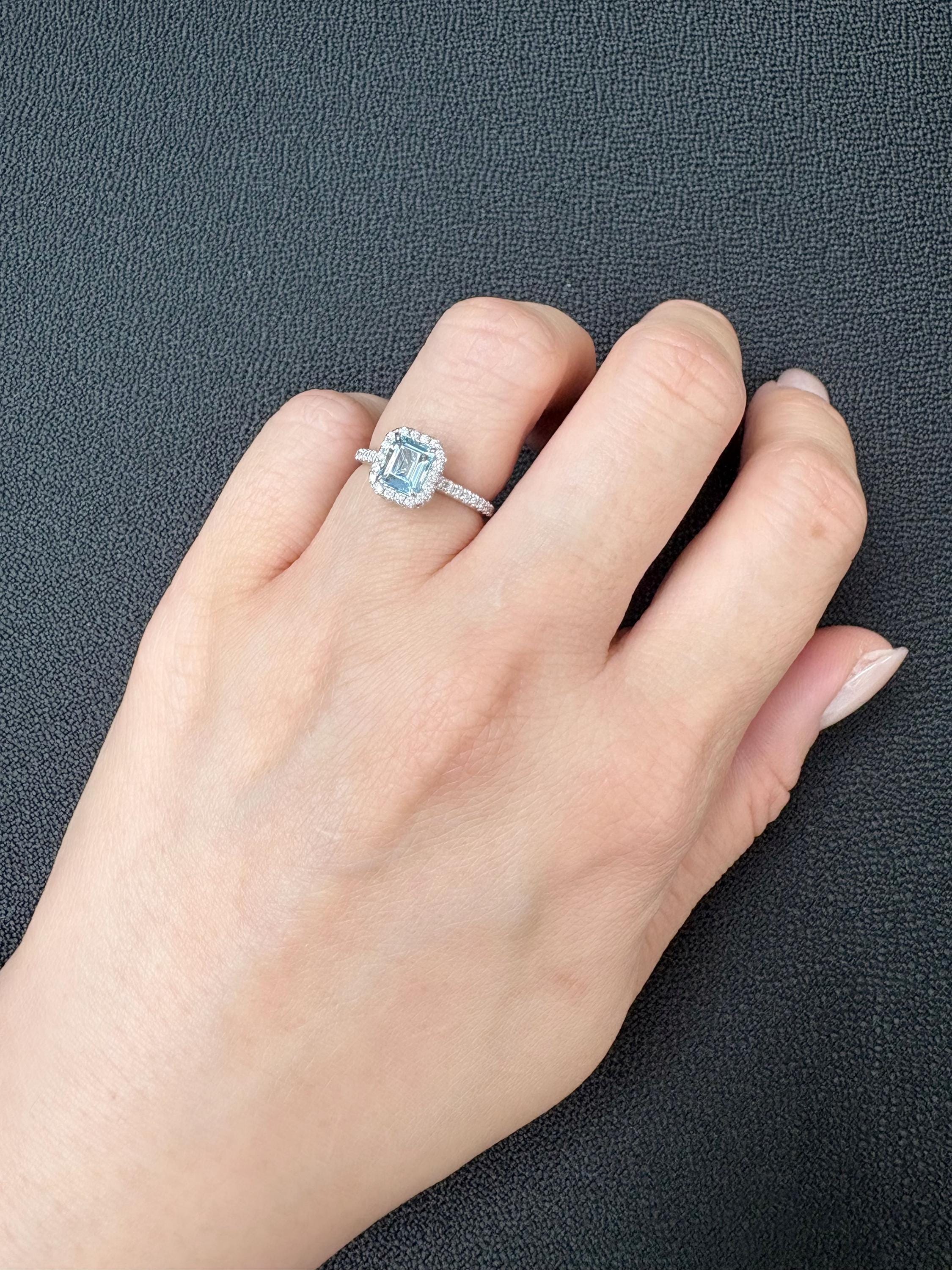 Skillfully handcrafted in 18K gold, this single ring features an emerald cut aquamarine center framed by a halo of round diamonds and diamond band-elegant for everyday or special occasions.