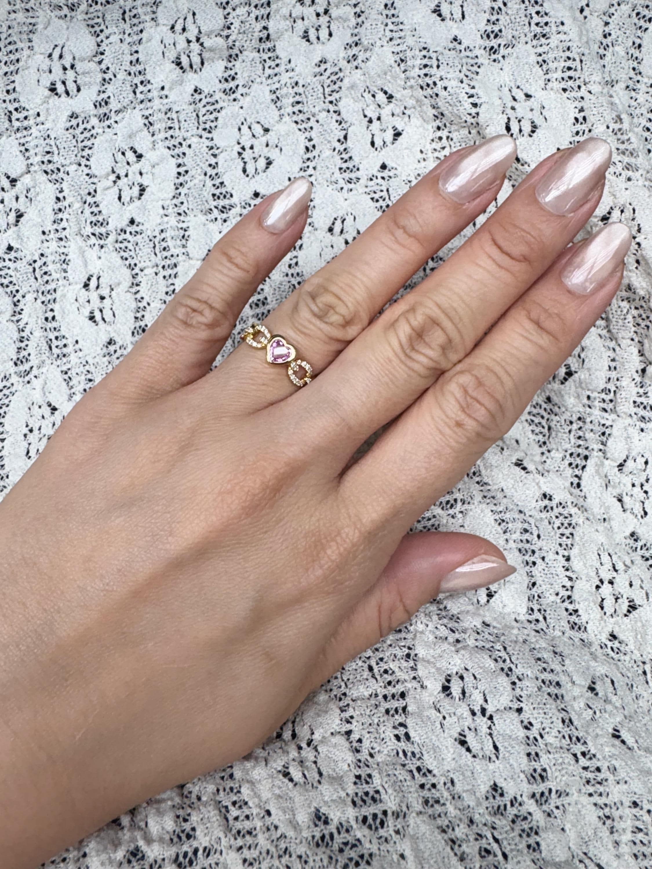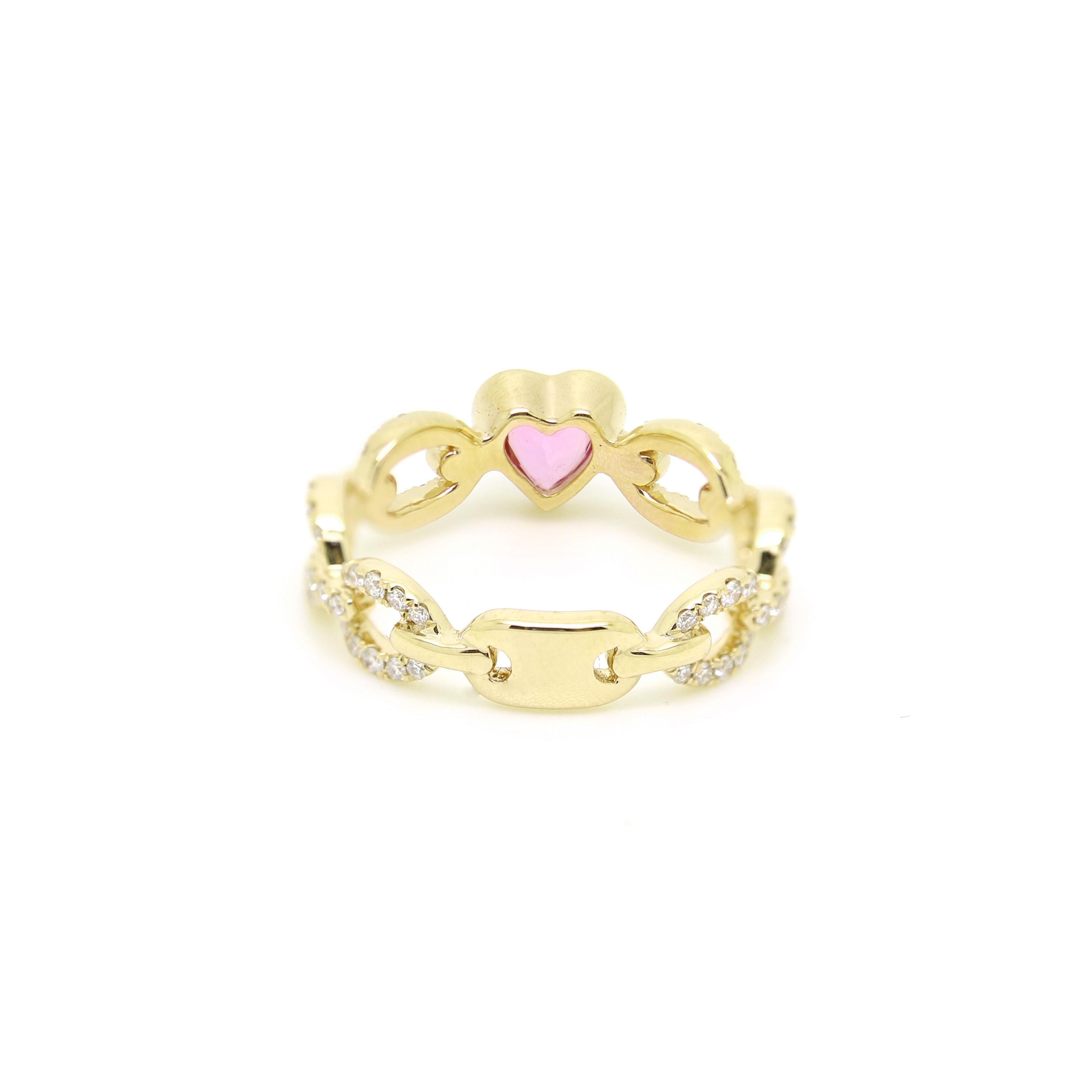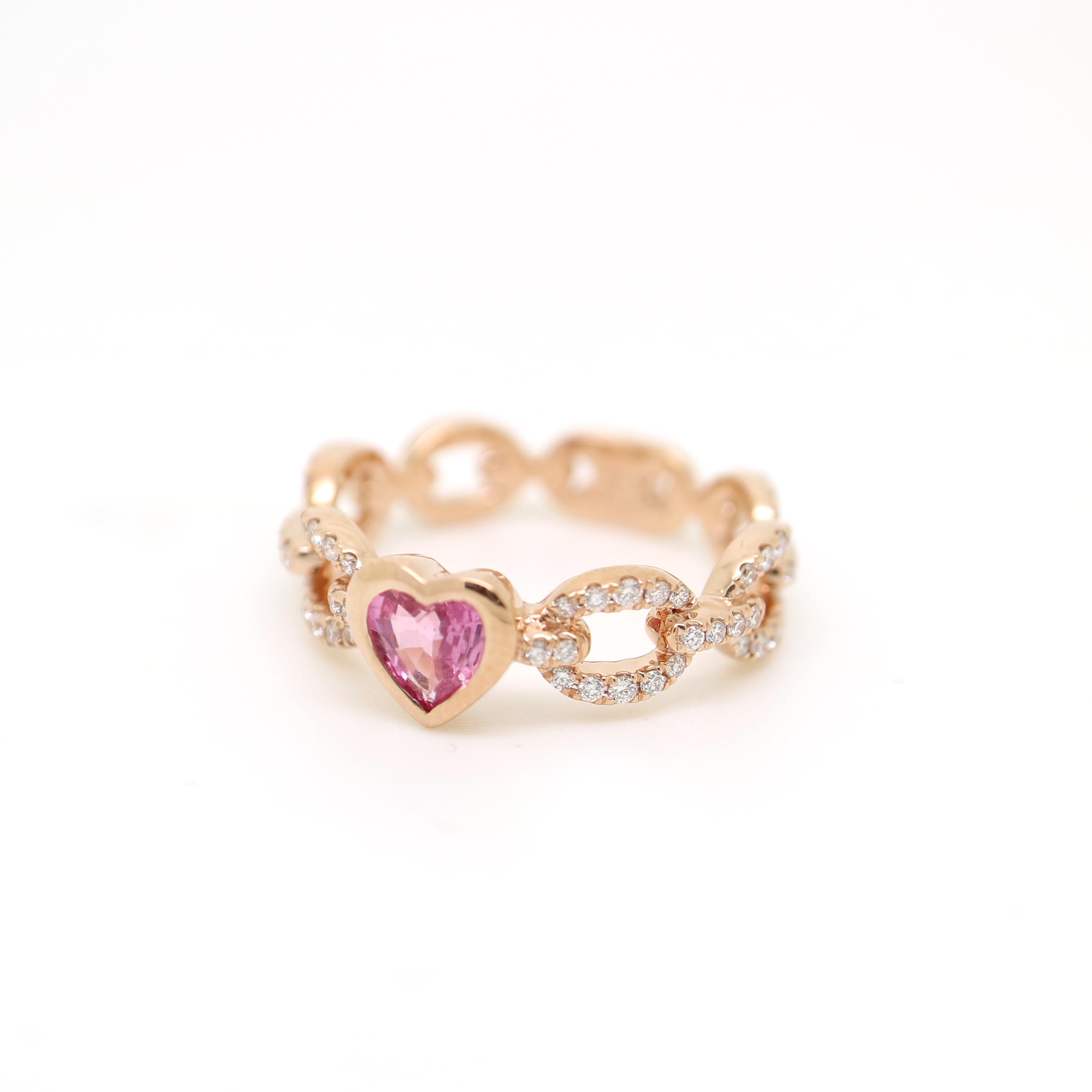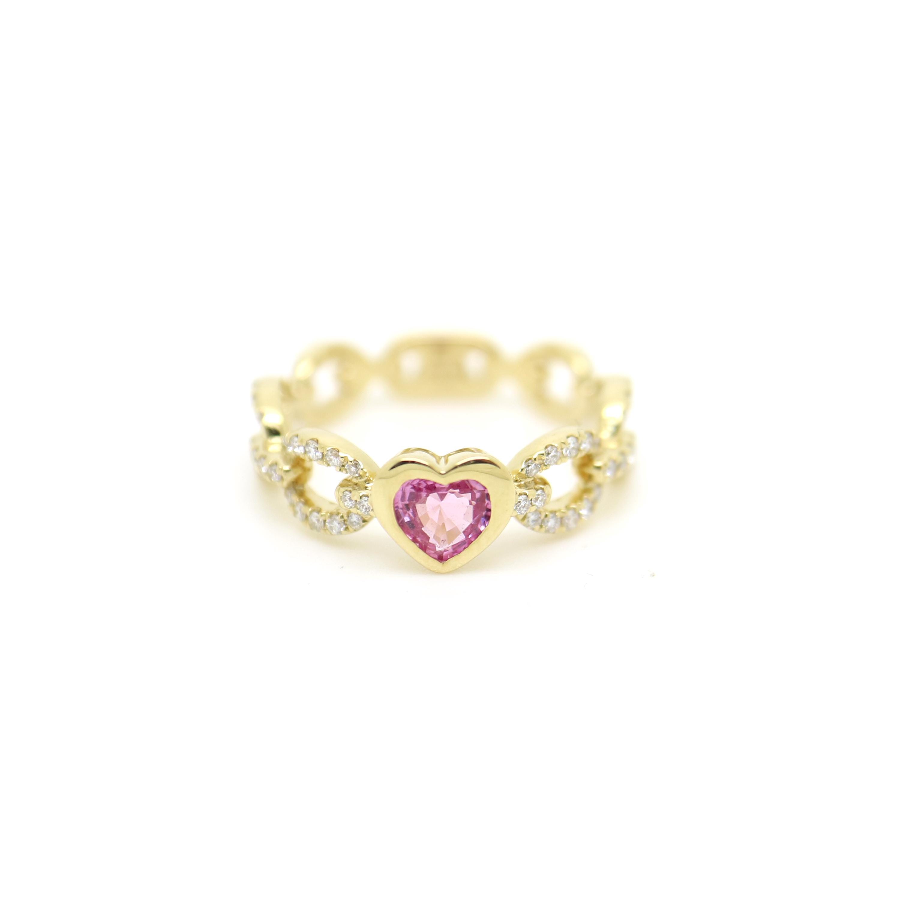 Skillfully handcrafted in 18K gold, this charming ring features a heart shaped pink sapphire center set within a polished bezel and framed by a band of sparkling round diamonds. The intertwining diamond‑set shoulders add graceful movement and everyday elegance-perfect for gifting, stacking, or wearing as a romantic statement on special occasions.